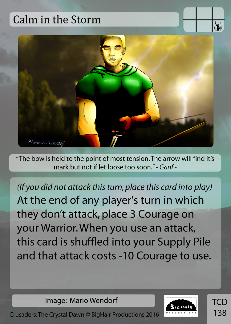 This card allows a player to make better use of the time between large attacks by passively gaining Courage. This shortens the time between attacks and even shuffles itself back into it’s user’s Supply Pile after the Courage boost is applied. The only consideration a play may have is that it does require a space to leave it in play and if you he or she already has cards in play, that may be a space too valuable to take up for very long.
