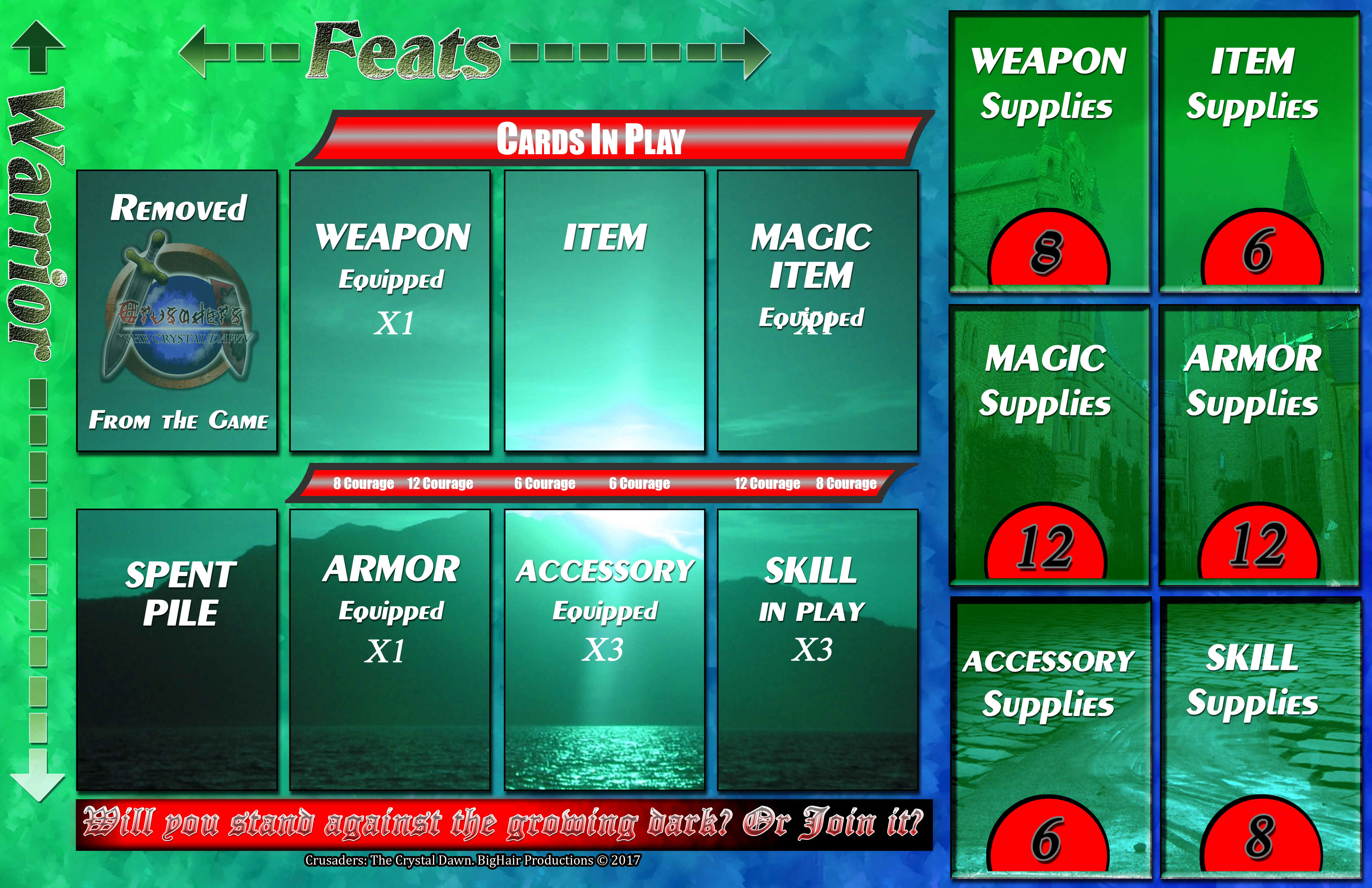 I should explain why the following changes would be implemented. In all the play testing for Crusaders, a common issue plagued most battles. Randomness. Not the kind that comes from dice rolls or the like. It was that certain characters require or at least greatly benefit from certain types of cards making their way into a game. Phrases like: